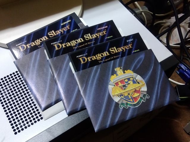わざわざ猛吹雪の中、液晶モニタの15kHz試験のために実家から召喚してきた化石。5インチFDDに対応するソフトがなかなか見つからず、たまたま出てきた『ドラスレ英雄伝説1』のオリジナルディスクを使ったが、すったもんだの挙句、結局2台(RDT1710V、RDT1714VM)ともダメ(OUT of RANGEエラー)と検証された。念のため、15kHz対応と考えているRDT1713LMで試したところ、画面右側にあたる部分が大きく映し出されるだけだった。これも気になったので、さらに掘り進め、年代物のソーサリアン(これもオリジナルディスク)を使って試したところ、今度は15kHzモードで普通に映し出された。
