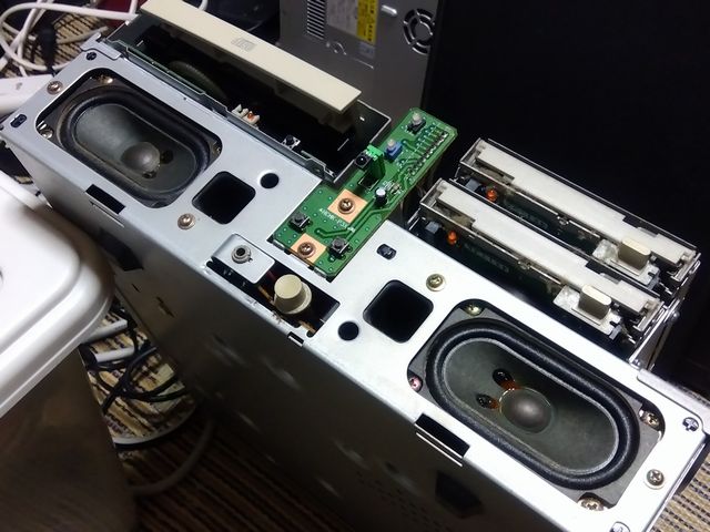 映像が出てこないCRT側は手のつけようがないので、PC部だけなんとかならないか早速バラしにかかった。プラスチック外装がフロントパネルとそれ以外の2分割構成なのはビックリだが、天板・裏面&横板部分はネジが左右2本ずつ(計4本)かあっただけで意外にアッサリ取外しできた。