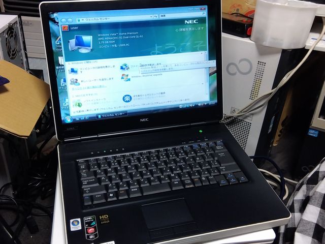 システム表示によるとQL-62(2.00GHz)とのこと。VistaHomePremium(32bit)が起動する。ディスプレイドライバがちゃんとしておらず、800×600の解像度で展開される。時計用電池が切れている可能性あり。
