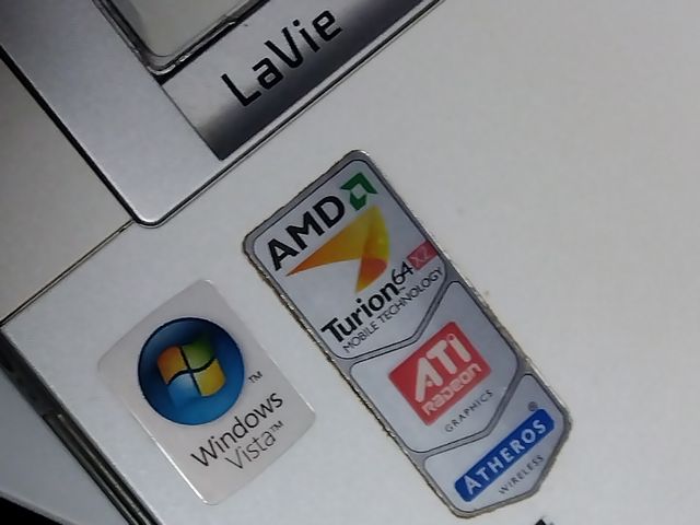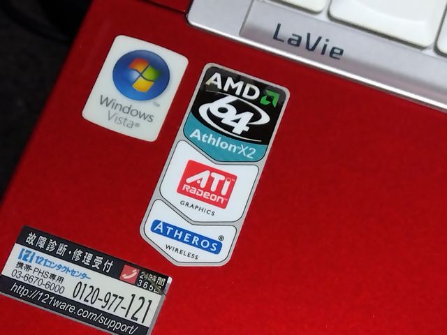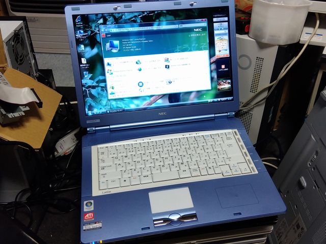 PC-LL550KG6BL、Sempron3400+でCPUラベルなし。塗装に薄く擦り傷があるが、かなりキレイなメタリックバイオレットの筐体。VistaHomePremium(32bit)が起動する。ディスプレイドライバがあたっており、1200×800の解像度でキレイに表示される。メモリも4GBと32bitのVisataでは最大容量入っている。HDDは標準でSATA120GBらしい。ちなみに色は正式には『ベリーブルー』と呼ぶらしい。