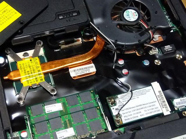 メモリ蓋を開けたところ、無線LANモジュールが。まぁ、例のロゴがあるから当然か…。